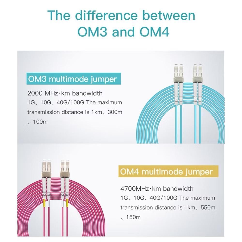 OM4 fiber optic patch cables feature an extremely high bandwidth–4700MHz*km, more than any other mode. They support 10GB to 550 meters and 100GB to 125 meters. These cables are suitable for high-throughput applications, such as data storage. These cables are fully (backwards) compatible with 50/125 equipment as well as with 10 gigabit Ethernet applications. With the OM4 cables, you can use longer lengths than OM3 cables while still having an excellent connection.