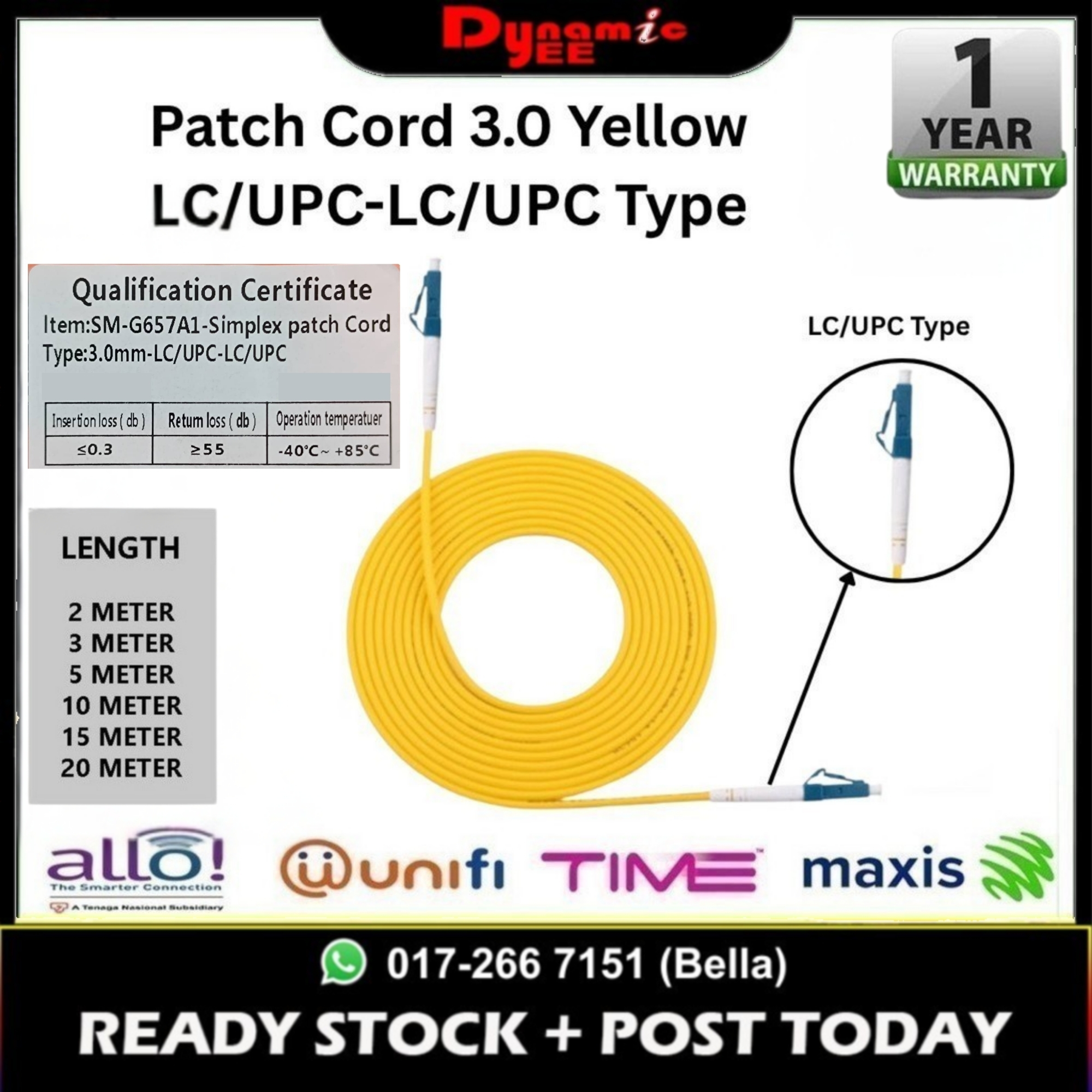 Patch Cord 3.0 Yellow LC/UPC-LC/UPC ( 1m, 2m ,3m ,5m ,10m ,15m,20m ) PC101